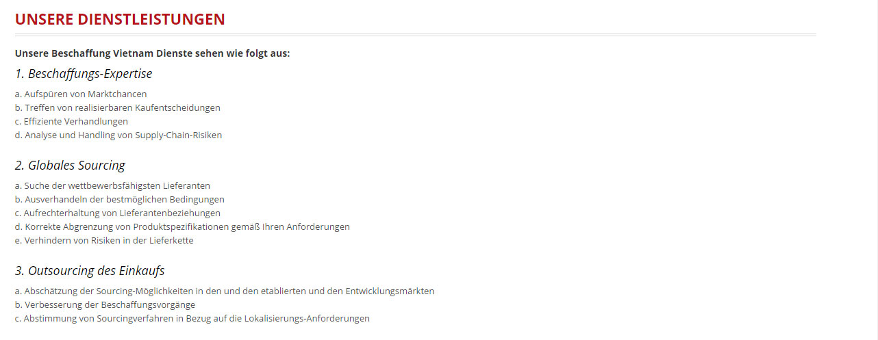 Unser Team besteht aus den erfahrendsten Procurement-Spezialisten, die aktuelles Wissen und Erfahrung in Bezug auf den vietnamesischen Markt mitbringen und sich mit dem Zuliefer-Netzwerk und den Sourcing-Vorschriften auskennen. Unsere Mitarbeiter sprechen fließend Vietnamesisch und sind geschickte Verhandler, wodurch sie die best-möglichen Konditionen für Sie erzielen können.